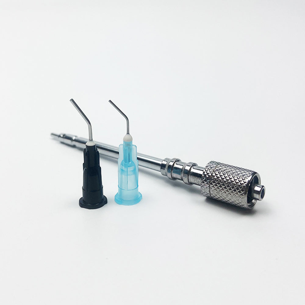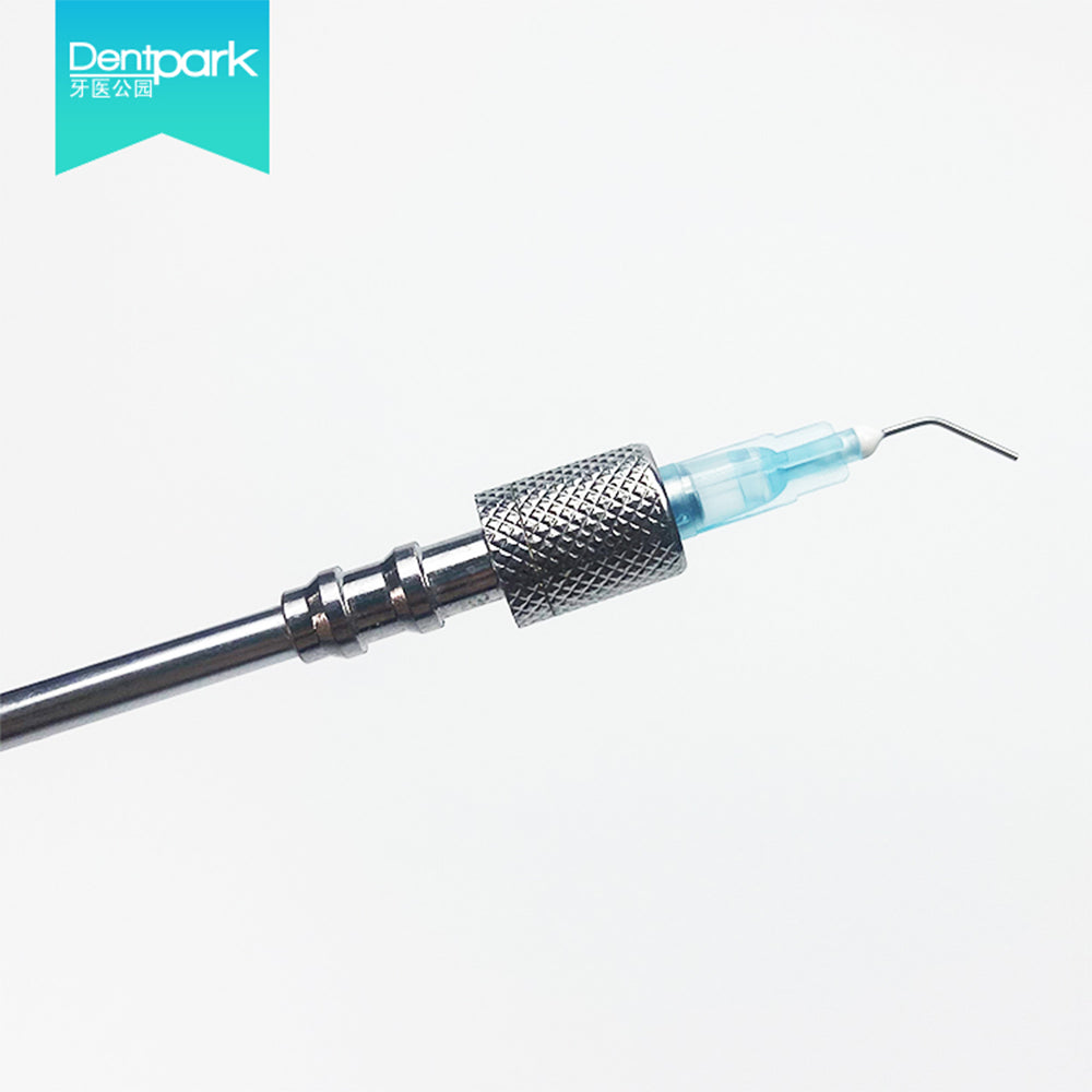 Srew can easily connect to prebend tips and irrigation needle with different diameters, it can be inserted into the root cancal for aspiration. Three ways of using: flush Water, flush air and flush fog.