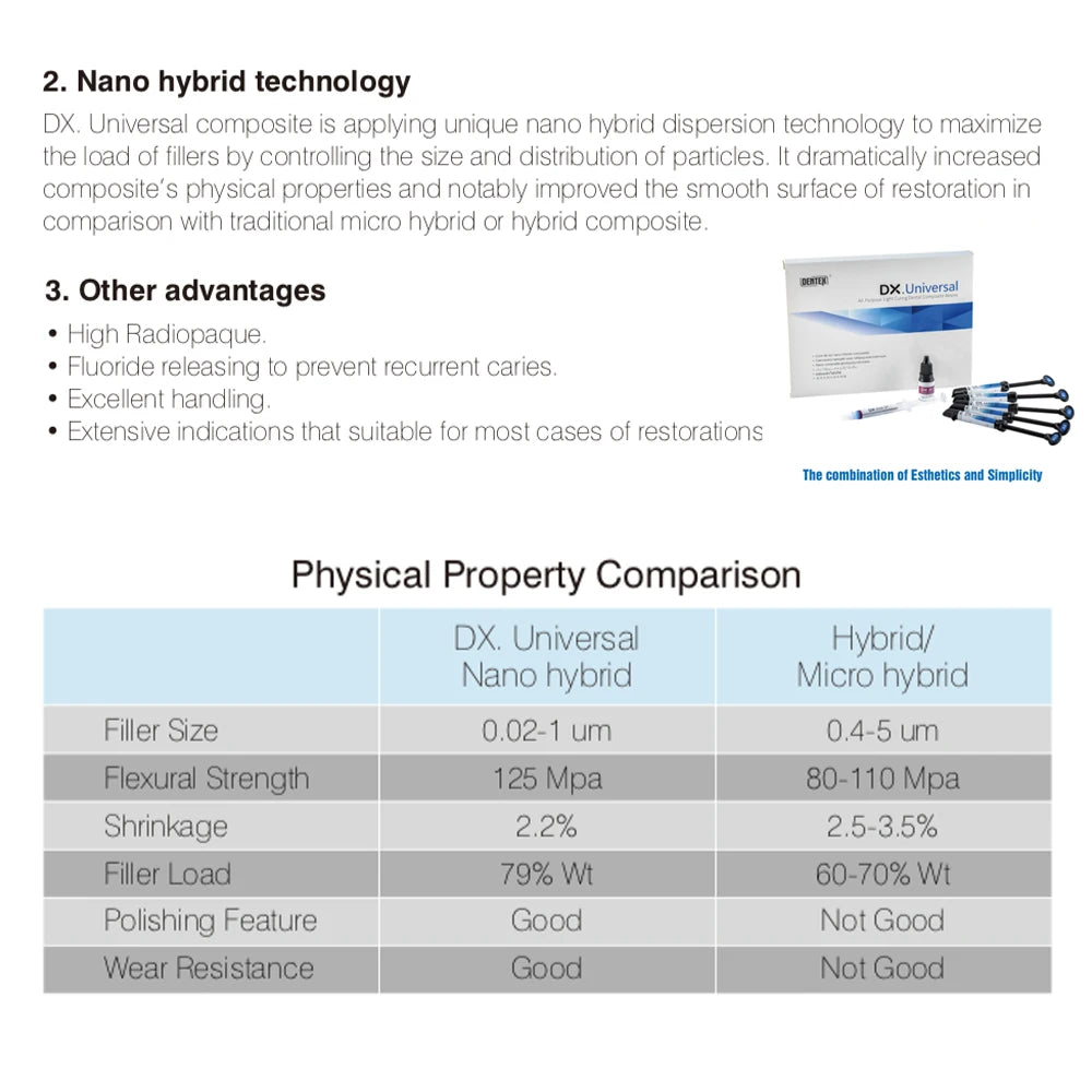 DX. Universal composite is applying unique nano hybrid dispersion technology to maximizethe load of filers by controlling the size and distribution of particles. lt dramatically increasedcomposite's physical properties and notably improved the smooth surface of restoration incomparison with traditional micro hybrid or hybrid composite.