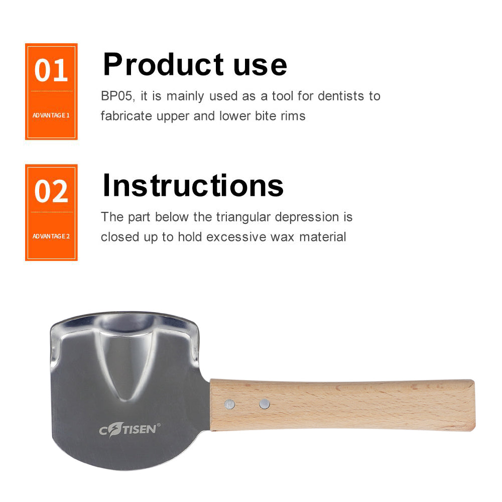 The rim farmer consists of a shovel head and a wooden handle. The overall shape of the shovel head is like a square circle; the edge of the working end is rolled up like a dustpanand the rolled-up part forms an obtuse angle with the shovel head flat. The part below the triangular depression is a closed up to hold excessive wax material. The metal part is madeof thick stainless steel, which has a good heat storage capacity and can be operated for a long time after being heated by the alcohol lamp. Wooden handle feels comfortable and has a good insulation effect. This rim farmer is easy to use, durable, and helps improve work efficiency. It is mainly used as a tool for dentists to fabricate upper and lower bite rims.